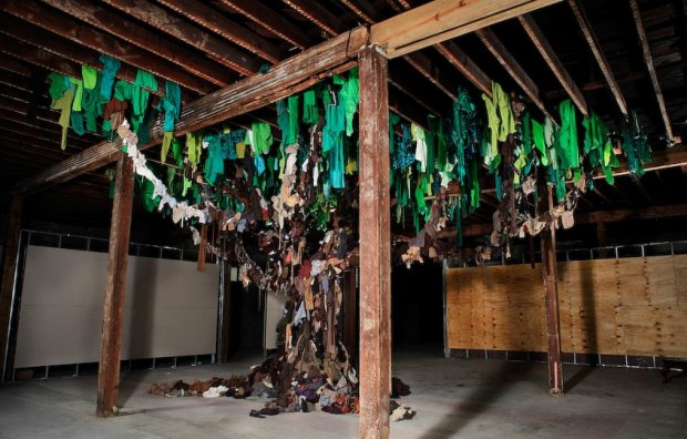Guerra de la Paz (GdlP) is a collaboration between Miami-based, Cuban-born artists Alain Guerra and Neraldo de la Paz. Over the past two decades, GdlP has transformed the castoffs from our collective wardrobe into poetic works that deliver powerful political and environmental messages. They explore the expressive qualities of discarded textiles, a journey that has produced an impressive array of dynamic sculptures and tactile installations. GdlP infuse their work with a thoughtful mix of caution and hope. In works such as “Atomic,” they create forms that allude to dire consequences if humanity remains on a path of relentless consumption and disposal. In other works, such as “Indochine, Bonsai Tree” and “Spring, Sprang, Sprung,” they explore the hopeful possibilities of reuse and renewal, breathing new life into reclaimed textiles that morph into sinuous trees before our eyes. In addition to creating representational forms, GdlP utilizes masses of material to evoke the burdens of excessive consumption and oppression. In “Mort,” they present a solitary figure on a fold-up bed, a prisoner suffering silently beneath the weight of a ponderous pile of dark-colored garments. In “Follow the Leader,” they present a colorful procession of draped figures, meandering blindly through the gallery space like a flock of thrift-store sheep. Does GdlP intend for us to see these masses of discarded clothing as a symbol of misguided choices in our consumer-driven societies? Or are they inviting us to step out of line and resist the temptation to chase the latest fashions and newest products?