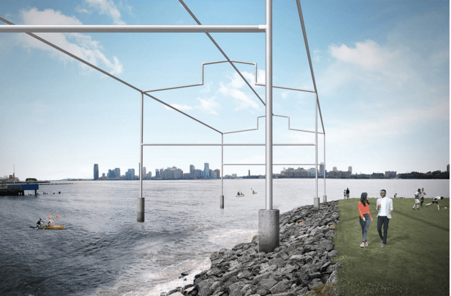 The project derives its inspiration and name from Gordon Matta-Clark’s 1975 artwork in which he cut five openings into the original Pier 52 shed. Hammons’s artwork would be an open structure that precisely follows the outline, dimensions, and location of the original shed—and like Matta-Clark’s work, it would offer an extraordinary place to experience the waterfront and view the sunset. Affixed to the shore on the south edge of Gansevoort Peninsula, the structure would extend over the water, employing the thinnest possible support system. It would appear evanescent and ethereal, seeming to shimmer and almost disappear, changing with the light of day and atmospheric conditions. Hammons’s Day’s End also alludes to the history of New York’s waterfront—from the heyday of New York’s shipping industry to the reclaimed piers that became a gathering place for the gay community. Open to everyone, the artwork would allow easy access to the river’s edge.