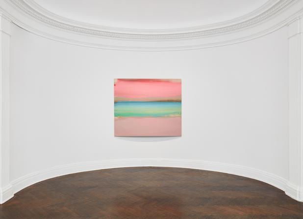 In “Untitled” (1974-75), Clark defines an oval inside the painting’s rectangular format by laying down a thin strip of tape to outline the oval. He has also laid down rows of horizontal strips that run the length of the painting. Unless you are standing close to the painting’s surface when you photograph it, none of this is visible in a reproduction. After he has prepared the surface, he uses a broom to push the cream-like acrylic paint evenly across the surface, from one side to the other. The grooves made by broom and the colors inside the oval do not completely match up with the markings on the outside. There are also the lines made by the tape strips that have been painted over, and the grooves where he has peeled the tape off, which is especially noticeable as it coincides with the oval’s circumference.