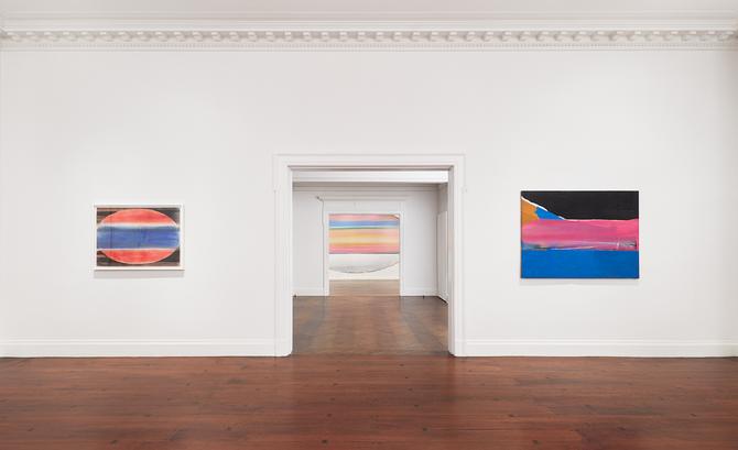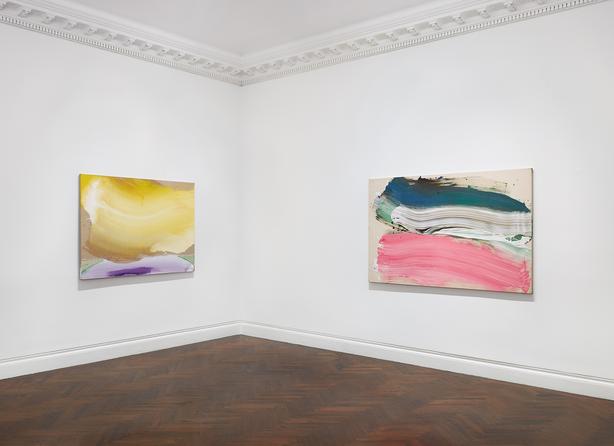 I began thinking about some of these issues when I went to the exhibition, Ed Clark: A Survey at Mnuchin Gallery, which includes a number of paintings made with a broom. It has long been repeated that when Clark began using a broom and painting on the floor, he was restating Jackson Pollock. If the unstretched oval painting, “Intarsia” (1970), which is 10 feet wide and more than 18 feet high, is any indication, he has mastered laying down the acrylic paint in what appears to be single strokes of varying widths. These grooved, unbroken strokes can be layered, one color atop another. We are looking at paint as paint, as well as paint as color and light, earth and sky. The artist, who enlisted in the US Air Force in World War II, neither flew nor saw combat, but he wanted to be a pilot.