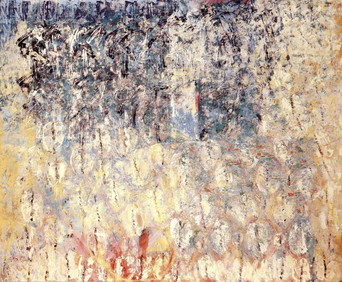 Visiting sculptor John Chamberlain’s studio’s one day in the early 1960s, Overstreet picked up a magazine featuring a photograph of a lynching of young black men, leading him to paint one of his best-known works,Strange Fruit (ca. 1965), a chilling semi-abstraction that shows a pair of legs with sneakers hanging down from the top of the picture. “I felt the most ridiculous anger I’ve ever felt, seeing this innocent kid they had maimed and disfigured and the neck was stretched,” he said, adding in another interview that one of the figures in the photo reminded him of his brother. “That photograph and the Billie Holiday song was probably what brought the painting together for me.”