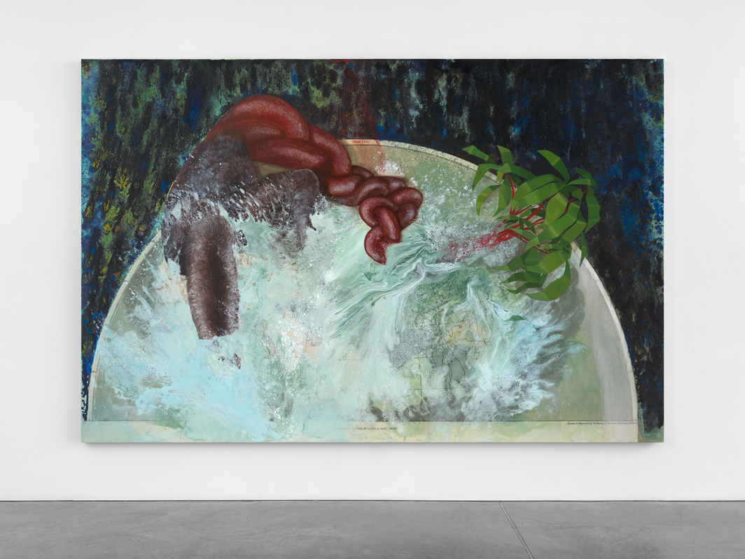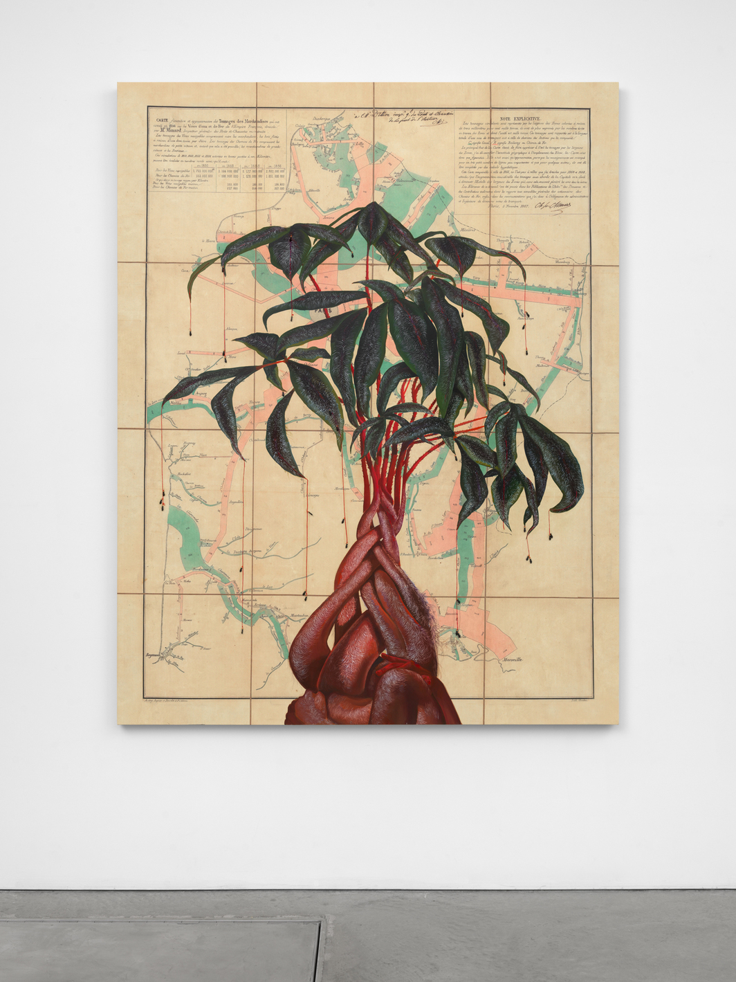 Her second exhibition at James Cohan features new paintings in which figuration, symbolic imagery, and calligraphic gesture are overlaid onto large-scale reproductions of historical maps and documents. Driven by the migrant experience of navigating and articulating spaces that are both familiar and physically distant, Báez’s new body of work is grounded in archival research into individual and collective modes of organizing space: the ways in which built infrastructure—and conceptions of place and community—reflect and reinforce social relations conditioned by gender, race, and class. For more than a decade, Báez has painted directly onto found cartographic or printed materials to disrupt the boundaries they serve to delineate. Questioning notions of past and present, mark-making and painterly gesture become means of situating subjugated personal memory and experience in dialogue with narratives of the Western tradition. The works in her exhibition carry forward this longstanding interest while upscaling source materials onto large-format canvas to allow for intervention in human proportion.