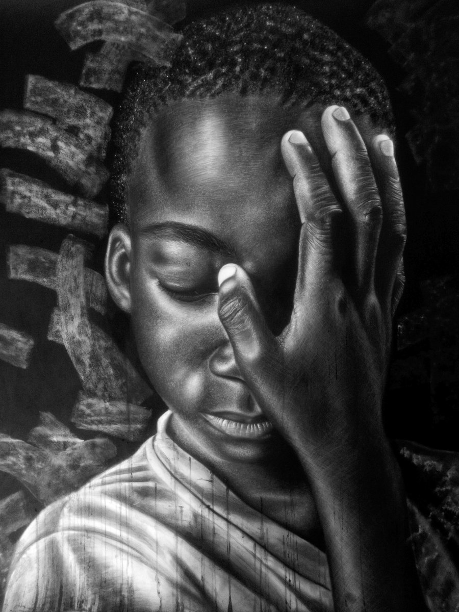I started using oil paints in 2019. I was into hyperrealism at the time, but I wasn’t feeling very free doing it. Here in Nigeria, a lot of young artists are visually drawn to hyperrealism. I think it’s just eye-catching, but it involves too much rules. There is a certain way you have to do things, there is this, and you have to do that. I didn’t always want to follow the rules. I wanted to explore. So I started mixing different mediums to see if I could come up with something different, something that could actually capture what I wanted to capture: black skin. Something that could bring out a lot of blackness in my works. I started exploring, and I came up with what I have now.”