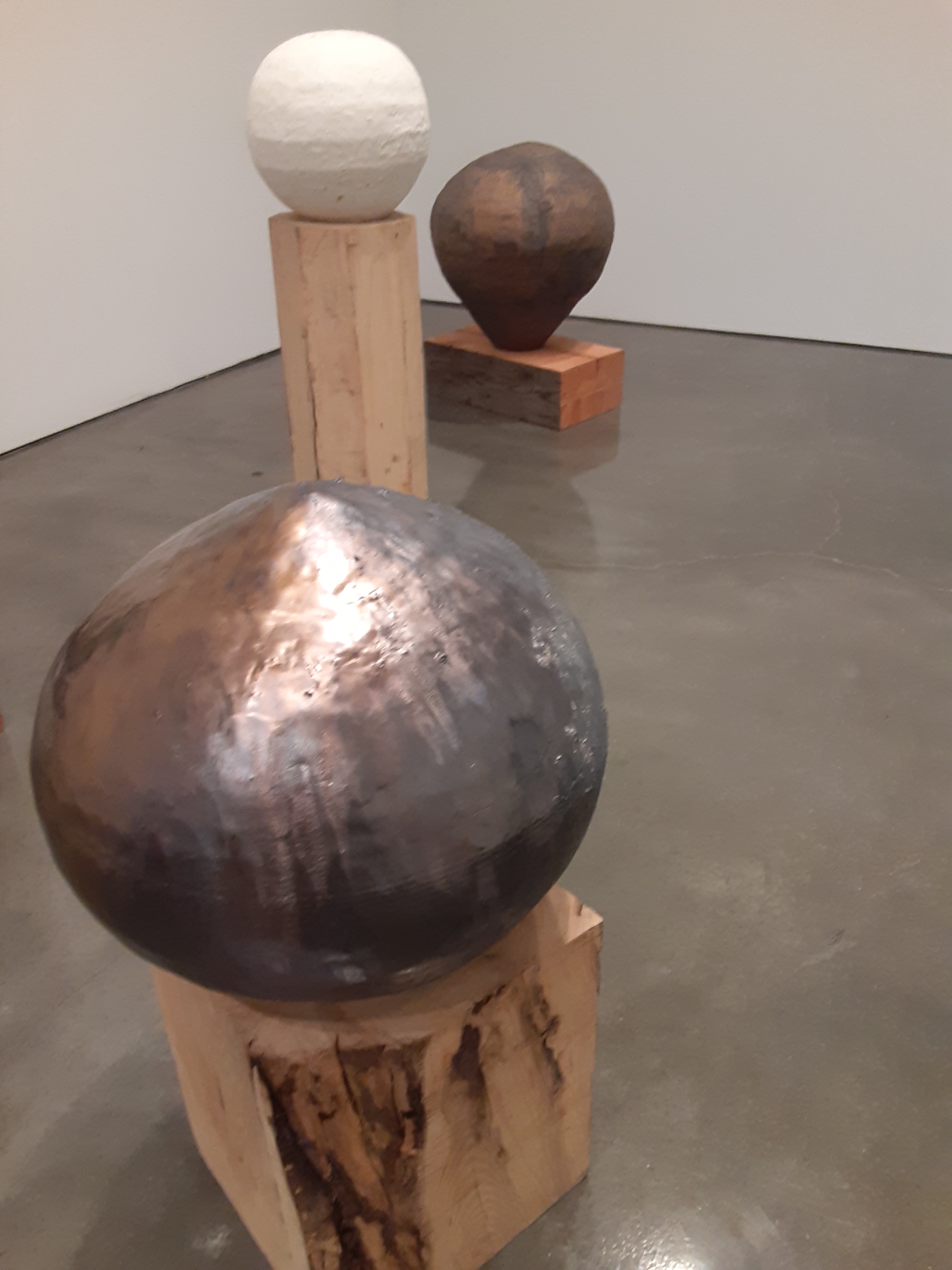 Switching scales from vessel as object to vessel as architecture, Gates has dramatically transformed the vast west gallery into a resonant place for shared contemplation by lining the walls entirely with Roman bricks customized from reconstituted remainders, blackened with manganese dioxide and dye. (A direct precursor to this gesture is the 2017 permanent commission Black Vessel for a Saint at the Walker Art Center in Minneapolis, a minimalist cylindrical shrine built from black bricks that contains a life-size statue of St. Laurence, the patron saint of librarians and archivists.)