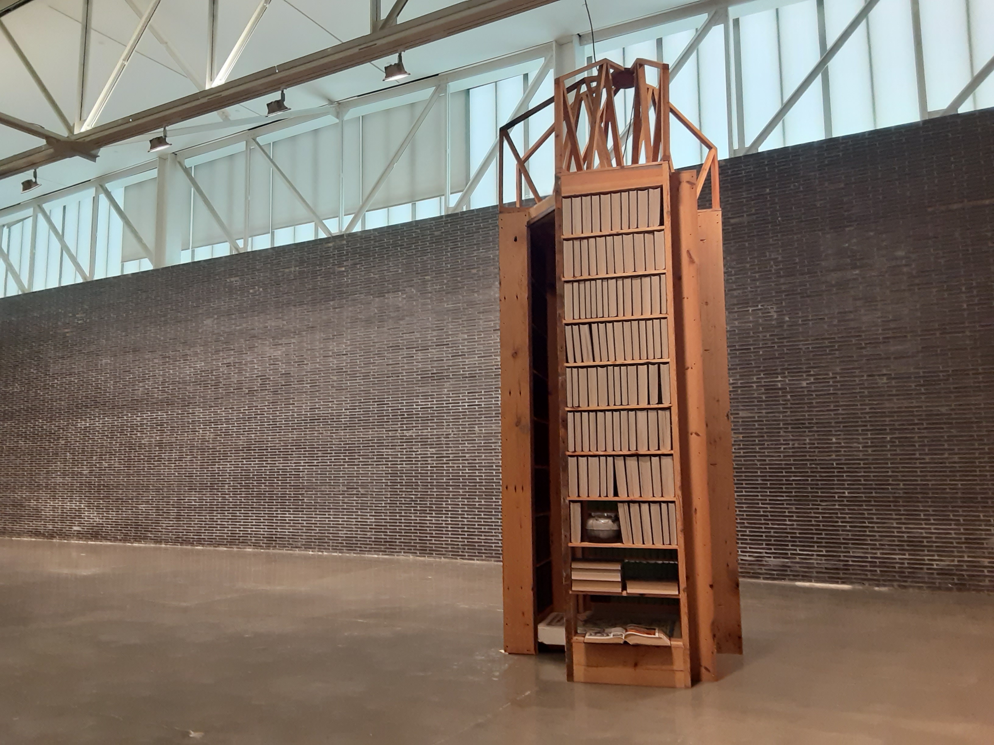 Housed in this awe-inspiring brick sanctuary are two large-scale archive works, both rich repositories of historic Black printed matter. The towering New Egypt (2017) houses the complete bound volumes of Ebony, the Johnson Publishing Company periodical (1945–2016) that promoted and celebrated the realities of Black American middle-class life. The red, black, green, and dark gray covers reference the Black Power movement, while the wooden shelving structure acknowledges various forms of Africanized architecture. The title of the work and its content reflect the teachings of Dr. Maulana Karenga, a founder of Kwanzaa and a prominent figure in early Africana studies, who posited that the Black American experience is adjacent to Nubian and Egyptian experiences of “African kingdoms.” Given that, historically, a key Western tactic to dominate other civilizations was to assassinate scholars and intellectuals and pillage or burn libraries, both New Egypt and its exhibition companion Walking Prayer (2018–20) serve as precious intellectual reliquaries whereby Black knowledge is restored and reconstituted as monuments to the truth of the Black archive and the importance of Black identity in the pursuit of world knowledge.