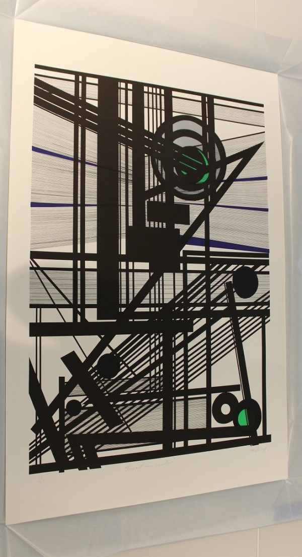 Mavis Iona Pusey’s unique aesthetic evolved over the course of a remarkable life and career that took her from rural Jamaica to the vibrant art scenes of New York, London, and Paris in the 1950s, ’60s, and ’70s. The dialectic seen in her work — of birth, destruction, and re-birth — mirrored her experiences as a mid-century African-American woman artist and expressed her senstivity to the “movement” of the city. Her work shares traits with several non-objective painting and printmaking schools —- constructivism, cubism, geometric abstraction, abstract expressionsim, Hayter’s Atelier 17— but Pusey’s work is imbued with an energy and vitality, informed by her aesthetic, that makes it exceptional.