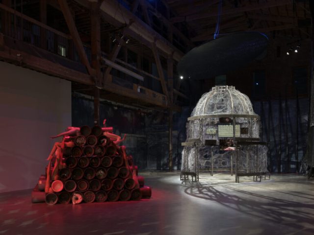 Abigail DeVille is best-known for her large-scale sculptural installations that engage the history of violence against marginalized people and places. For Brand New Heavies, DeVille has created The Observatory, a monumental installation composed of steel trussing, chicken wire, and charred wood that takes aim at Washington, D.C.’s Capitol Building. A scaled-down version of the Capitol dome, The Observatory will house a complex network of miniature video portals that combine still photography, video shorts, home videos, and archival footage of significant historical sites, including the Historic Stagville Plantation in North Carolina, Sullivan Island in South Carolina, and the Combahee River. Above the 20-foot structure, charred liberty poles hang inverted and suspended from the ceiling. This reversal of a common symbol of freedom (dating back to the colonization of the Americas) suggests an alternative history to the one commonly perpetuated, and the videos inside the dome similarly construct a parallel account of those who have been fighting for freedom since the 16th century.