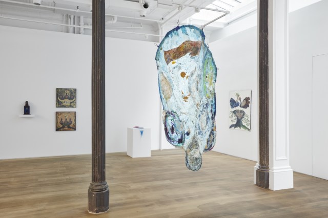 Without photographic documentation from the era, the Ortuzar Projects exhibition aims to reconstruct the Sapphire Show by assembling works produced in the late 1960s and early 1970s, including Bohanon’s mystical applied acrylic works (Rio on My Mind, c. 1970); Jackson’s graphite sketches (Interlocation, 1969) and painted effigies (Not Every Clown Lives at the Circus, 1967); Saar’s mythological work in print (A Siege of Sirens, 1966); Nengudi’s lustrous, vinyl-sealed fluid (Untitled Water Composition, 1969–70); Cole Meo’s canvases densely accrued with obscure material (Forbidden Fruit in Garden of Eden, 1965); and Nelson’s sculptural assemblage seeded with organic amulets (Wood City, 1970). The later works on view—such as Jackson’s Rag-to-Wobble, 2020 and Nengudi’s In My Backyard, 2020–by turns contradict, transform, or complement the earlier efforts of each artist and those of her peers, which for the first time since 1970, can be seen in juxtaposition here.