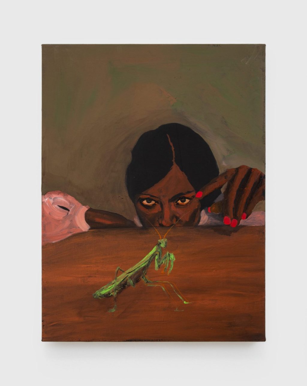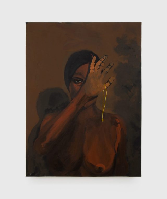 Mckinney’s paintings present intimate portraits of a lone protagonist, primarily female, lost in moments of deep reflection and respite within lushly colored interior spaces. In these scenes, the artist pays particular attention to the gaze of her subject. At times, the figure captures the viewer’s eye, but most often the subject focuses on a space only visible to them, engrossed in their own solitude and rituals. The nuanced details of the paintings – a trail of smoke, the glisten of a necklace – invite further observation to reveal hidden narratives, exploring themes of spirituality and the self with cathartic effect.