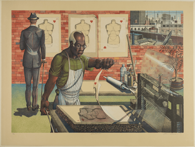 Blackburn was raised in Harlem, New York, during the Harlem Renaissance, an unparalleled flourishing of the arts centered in New York City’s Black community. The arts were considered crucial to the well-being of society as well as a fertile medium for activism and these values resonated with Blackburn throughout his life and work. In 1947, he founded a printmaking workshop as a welcoming space where artists of any level and from any background could learn and create together and it remains in operation to this day.