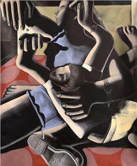 Employing techniques from different fields, Aksiniya Misyuta veers between figurative and abstract imagery, though avoiding depictions executed in pure abstraction. Often rendered with cubist attributes, the emerging artist‘s works are characterized by a geometrically stylized approach that conveys magnetism submerged in a dystopian environment. Without clear facial features, her obscure figures become articulate with the shadowy topological framework of the well managed space. Misyuta is a painter of voluptuous forms focused on situational portraiture, while her paintings are signified by their proportionally oversized or exaggerated figures. Regardless gender, the artist illustrates rough-textured gigantic appearances in an alluring way. Besides the bulky sizes, the enigmatic bodily development of significant geometry is providing alternative perspectives in the viewer’s eyes, underlining motion and rhythmic play.
