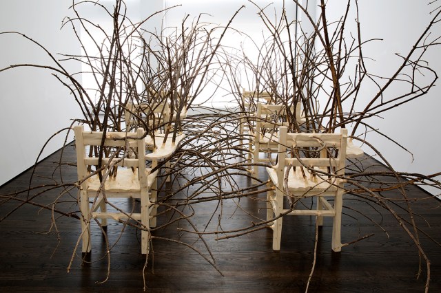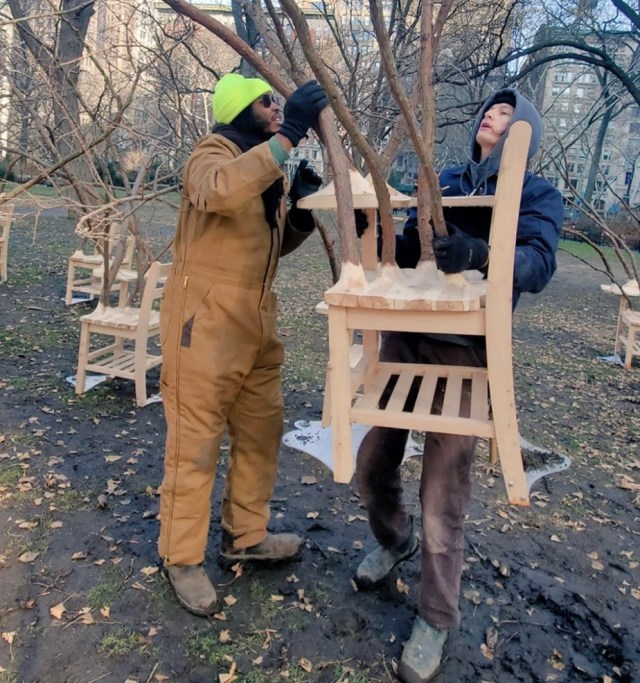 Brier Patch, Madison Square Park Conservancy’s 42nd commissioned exhibition, Hayden is fabricating tablet arm desks that sprout a tangled mass of tree branches, which will be presented across three different lawns in the park. The largest group of 50 desks, arranged in a grid pattern, will be sited on the Oval Lawn; another grid of 25 will be situated on Sparrow Lawn across from the playground in the Northeast corner of the park. A final group of 25 chairs on the Veteran’s Lawn will be presented without branches, enabling visitors to sit at the desks.