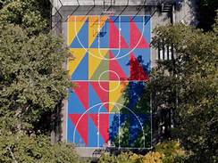 This basketball court mural is based on Faith Ringgold’s 1974 work, Windows of the Wedding #1: Woman. After exploring abstract shapes in the 1970s, Ringgold received acclaim for her narrative quilts created in in the 1980s. The basketball courts at St. Nicholas Park begin as an abstract pattern, but as hundreds, if not thousands, of stories play out across the courts surface it will be transformed into something of living narrative quilt. Ringgold was born in Harlem in 1930 and graduated from City College of New York (adjacent to the St. Nicholas Park).