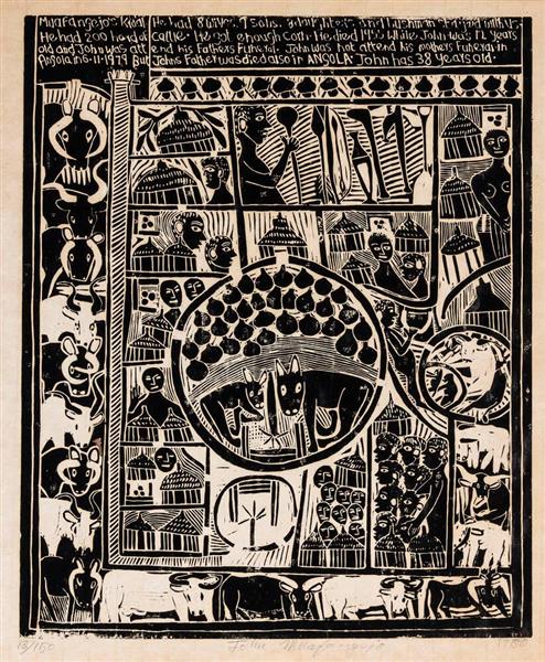 In his prints Muafangejo used a clear and unambiguous language – he could literally and figuratively tell a story in black-and-white, and there is always a strong narrative component in his work. Characteristically, a dramatic incident often forms the subject of his prints with the ‘characters’ in the story dispersed over the sheet, occupying a shallow space. This narrative is often extended, with text incorporated into the print. Text at times becomes so important that the print resembles a page from a medieval illuminated manuscript.