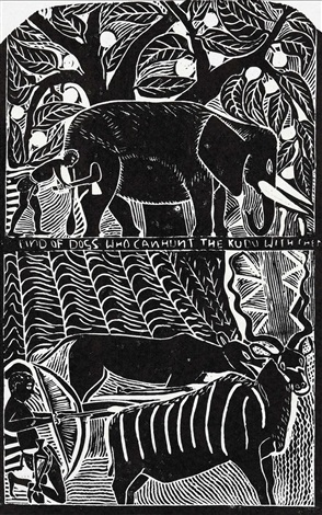 Although he produced a number of tapestries and paintings while at Rorke’s Drift, Muafangejo is known almost entirely as a printmaker; his linocuts are also particularly well known. In this respect, Azaria Mbatha (qv.), who favoured the medium, influenced Muafangejo as did many other artists who studied at Rorke’s Drift. In addition, the relative inexpensiveness of the medium and the fact that it does not require sophisticated printing equipment made it an attractive and feasible option for many black printmakers. But, like many others, when Muafangejo had access to the necessary equipment and materials, he produced an impressive body of woodcuts and intaglio prints. In intaglio, he seldom used etching on its own, preferring to combine it with aquatint (for tonal areas) and he was particularly adept in the use of drypoint – where the image is scratched directly into the plate. The immediacy and vividness of drypoint proved a sympathetic medium for his images.