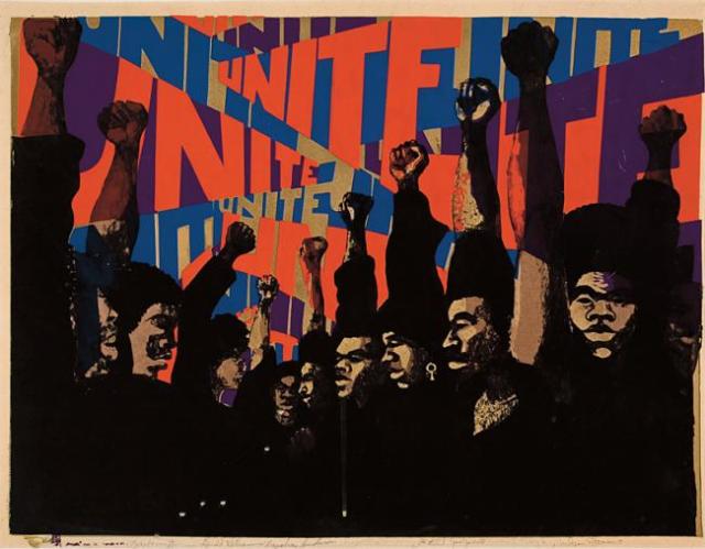 Painter and printmaker Barbara Jones-Hogu was a founding member of the African Commune of Bad Relevant Artists (AfriCOBRA), an artist collective formed in Chicago in 1968. Members of AfriCOBRA visually expressed the central ideas of the Black Power movement—self-determination, unity, and black pride. The group shared the idea that their art should be uplifting, highlighting the beautiful and heroic aspects of African American experience, and should be easy for ordinary people to understand. As a result, AfriCOBRA produced a unique aesthetic, characterized by simplified forms, vivid colors, and strong, often competing, patterns. One of Jones-Hogu’s most important contributions to AfriCOBRA’s style was the incorporation of words into her images to make their meaning perfectly clear. Prior to her involvement with AfriCOBRA, Jones-Hogu studied art at Howard University, the School of the Art Institute of Chicago, and the Illinois Institute of Technology. Though best known for the screen prints she created and exhibited while a member of AfriCOBRA, Jones-Hogu was originally a painter, and in 1967 she contributed to the mural Wall of Respect on Chicago’s South Side. In her later years, Jones-Hogu continued to work in Chicago as an artist and started using digital imagery and making documentary films