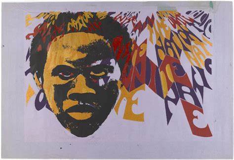 The Library purchased One People Unite (1969), a color screen print on Crescent artist board covered in gold metallic paper. The mix of colors, shadows, and type, Lawson said, gives the piece a 3-D effect and a feeling of visual movement.
