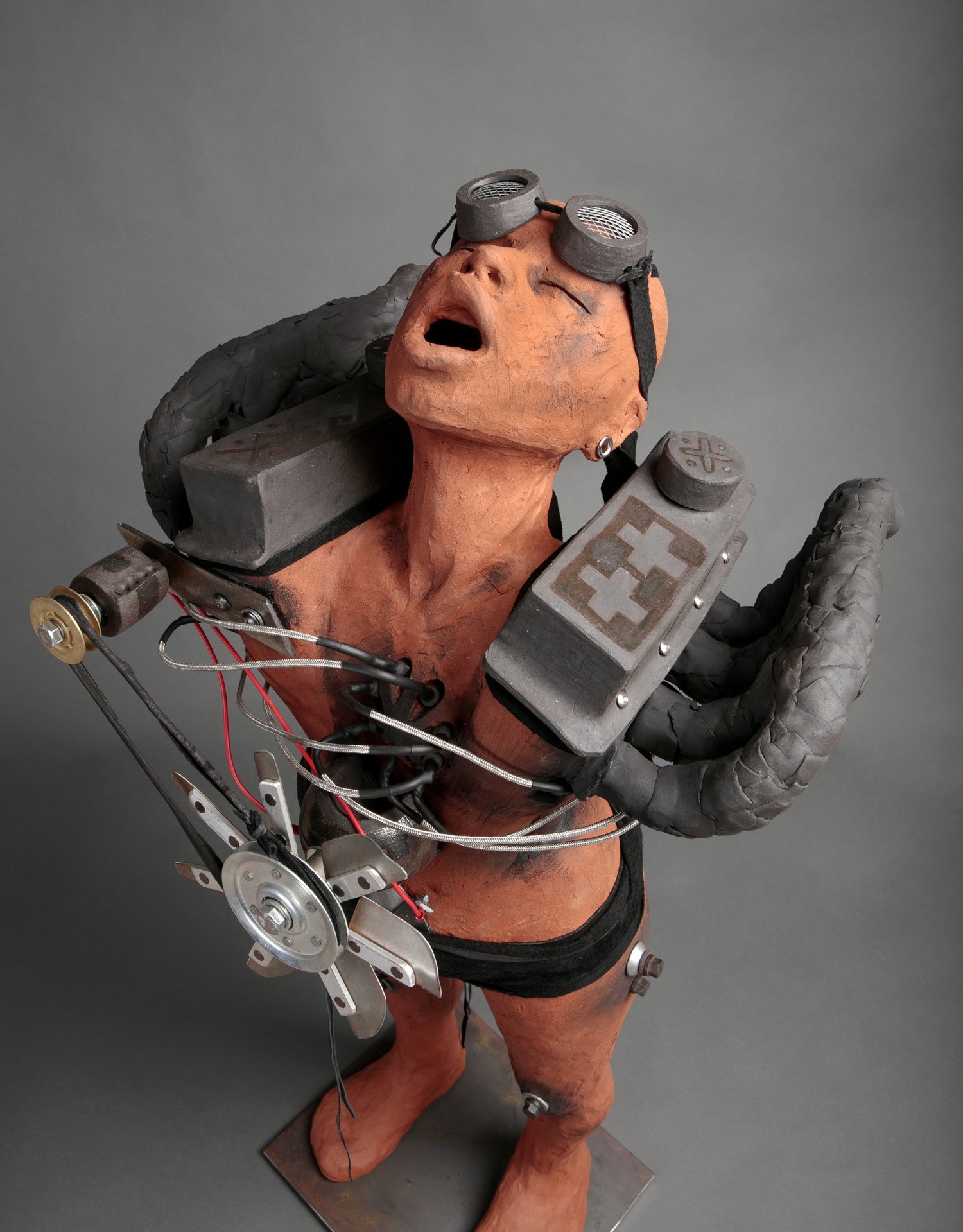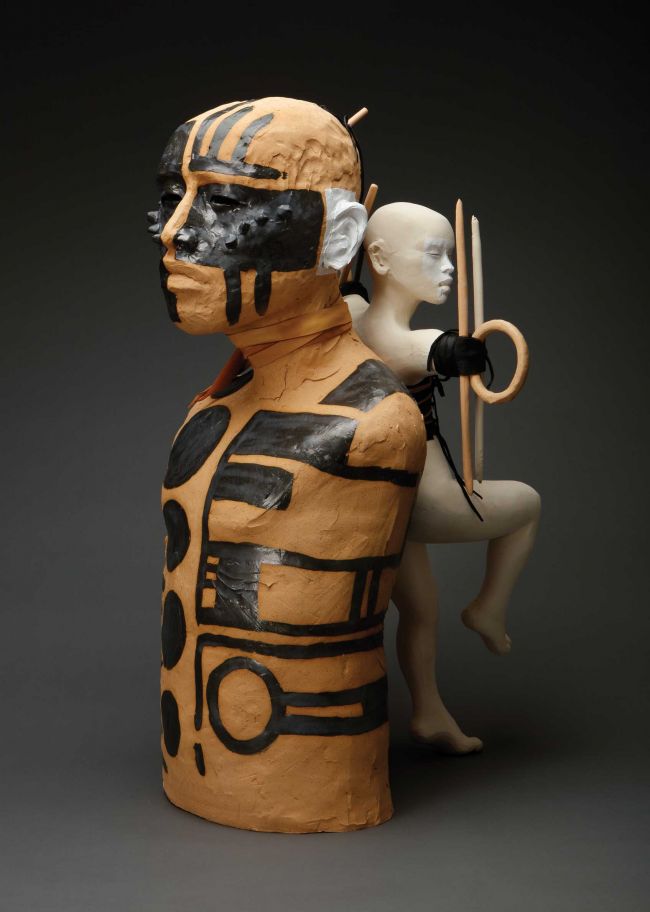 Androgynist clay figures adorned with found and manufactured objects are often at the base of Simpson’s practice. The pieces are ruminations on family, gender, marginality, as well as the effects these aspects have on the understanding of self. While the choice to work in clay is a link to familial relationships, the inherited nature of the material also adds to the concepts being presented. Just as individuals are shaped by memory and experience, objects made of clay become a record of the process that shaped them. The resulting pieces are both powerful and vulnerable and offer intimate records of self-exploration.