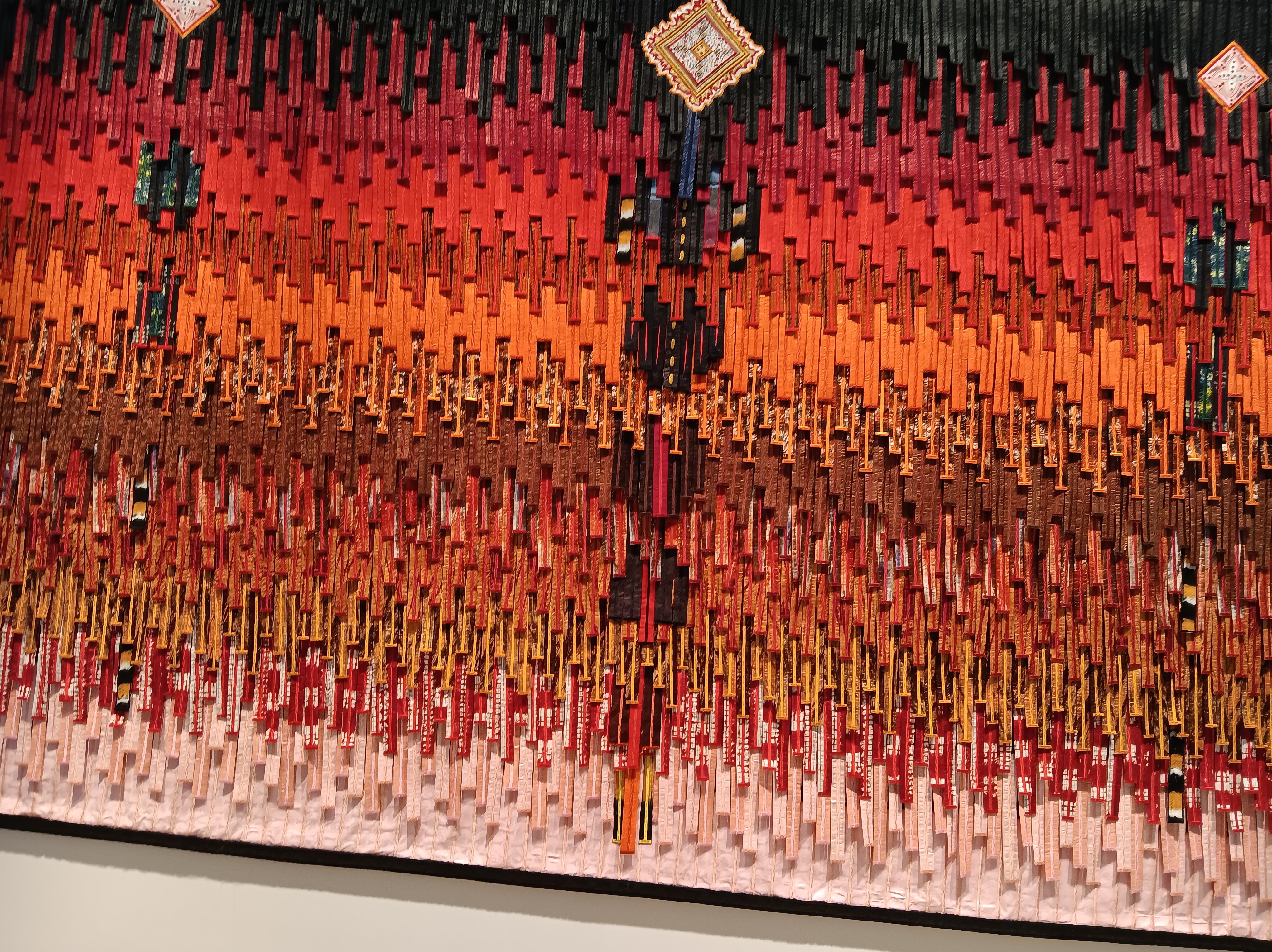 Konaté’s new works are inspired by his recent travels through West and North Africa—and invoke a range of motifs and colors found in the architecture, sculpture, textiles, and ceramics of Mali, Cameroon, Niger, Morocco, and Tunisia. Exploring the aesthetic possibilities of each form and impression that he employs, Konaté’s contemporary abstract language is deeply rooted in traditions of craftsmanship and artistic creation. Poetically merging the personal and the collective, his evocative textile works encapsulate and convey the presence of individual and shared perception, and the histories of material commemoration and expression.