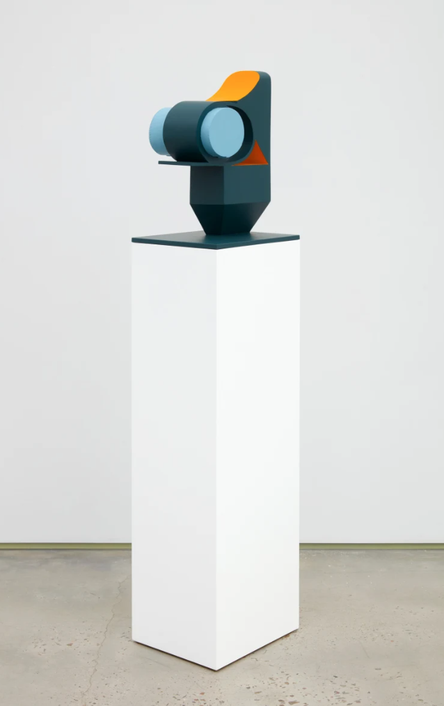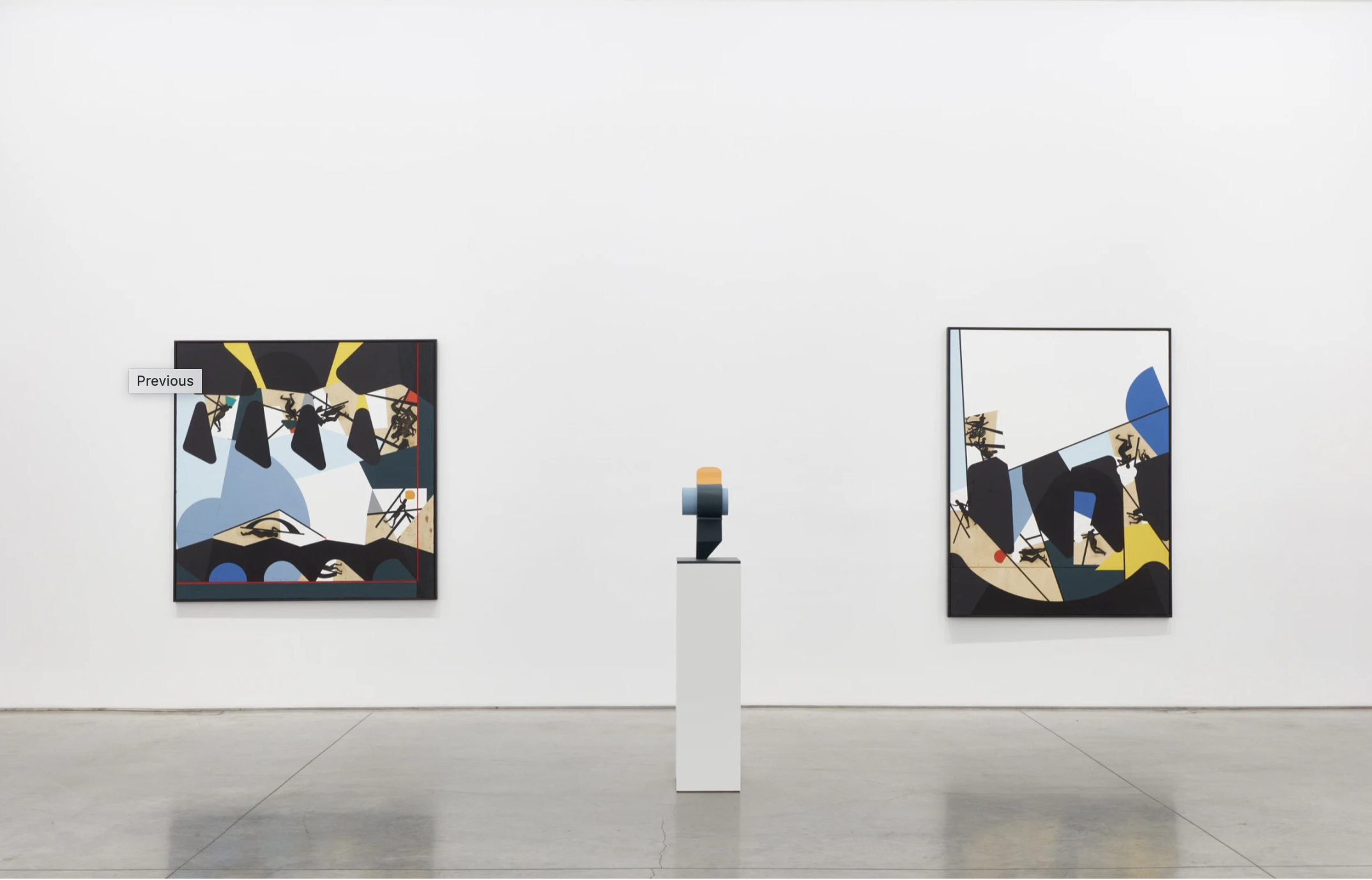 For Configurations in Black, Nitegeka debuts a new suite of paintings and sculptures—which he began working on more than two years ago, in a season of experimentation following a global pandemic. In the resulting paintings on plywood, Nitegeka conjures abstract landscapes defined by loose, organic planes of color—dark gray, bright orange, sunny yellow, vibrant teal. Heavy black lines run across the compositions at various angles while silhouetted figures—borrowed from the artist’s 2012 film Black Subjects—tumble through space, many of them balancing bundles on their backs or shoulders. On canvas, a material Nitegeka returns to for the first time since university, the heavy black lines that appear on plywood—and throughout the artist’s oeuvre—vanish, leaving the figures to float through the landscape with no sense of a horizon line, no sense of which way is up or down, no sense of where they’re coming from or where they’re going. With the painted wood sculptures, Nitegeka evokes the unnamed parcels that the figures in the paintings carry on their backs and shoulders, representing, perhaps the personal effects—and psychological burdens—that migrants carry along their journeys.