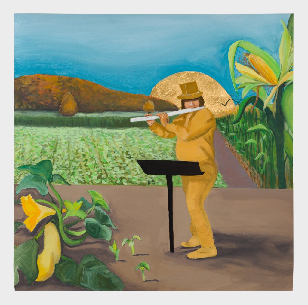 Brent Michael Davids is an award-winning composer and co-director of the Lenape center. He is an enrolled member of the Stockbridge-Munsee Band of the Mohican Nation. The landscape behind him is a combination of the Delaware river, Lenape land and paintings of the “three sisters” crops that were important to the Lenape people: corn, beans and squash.