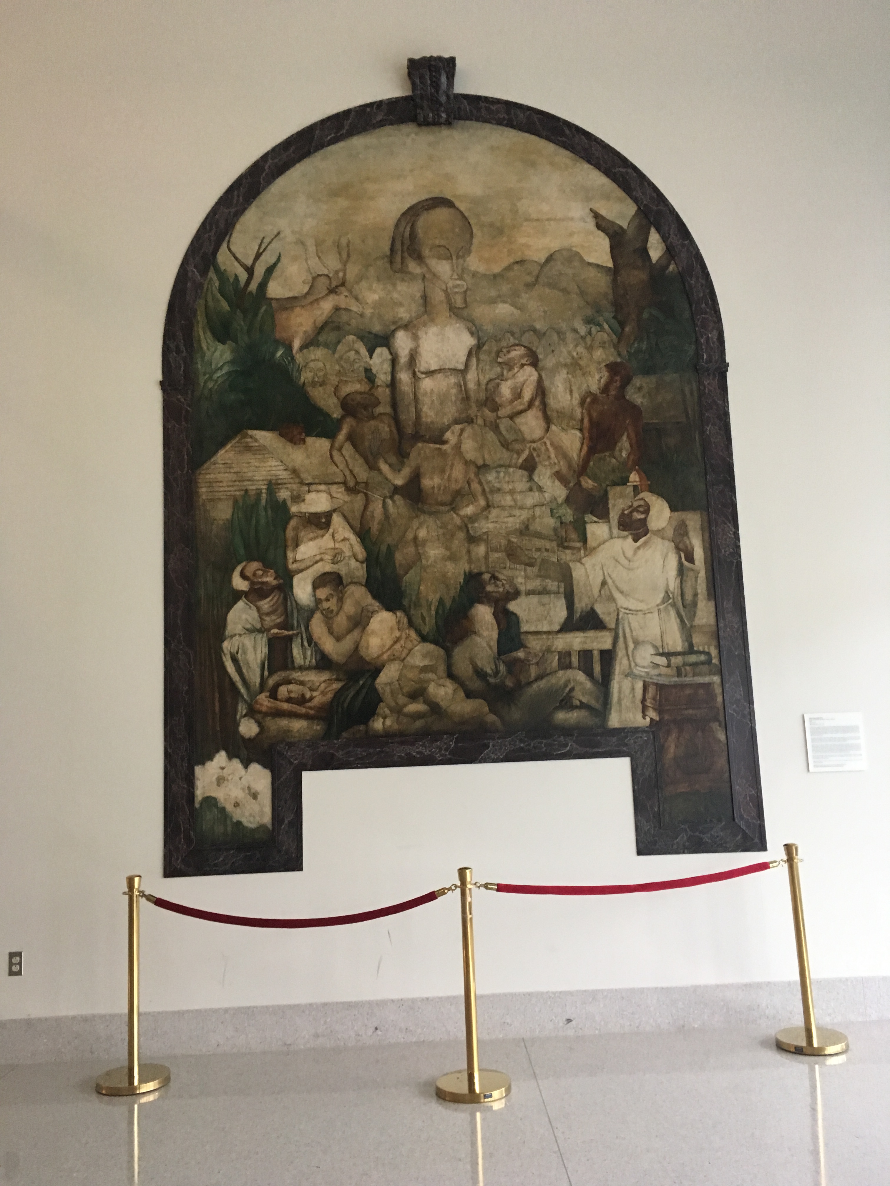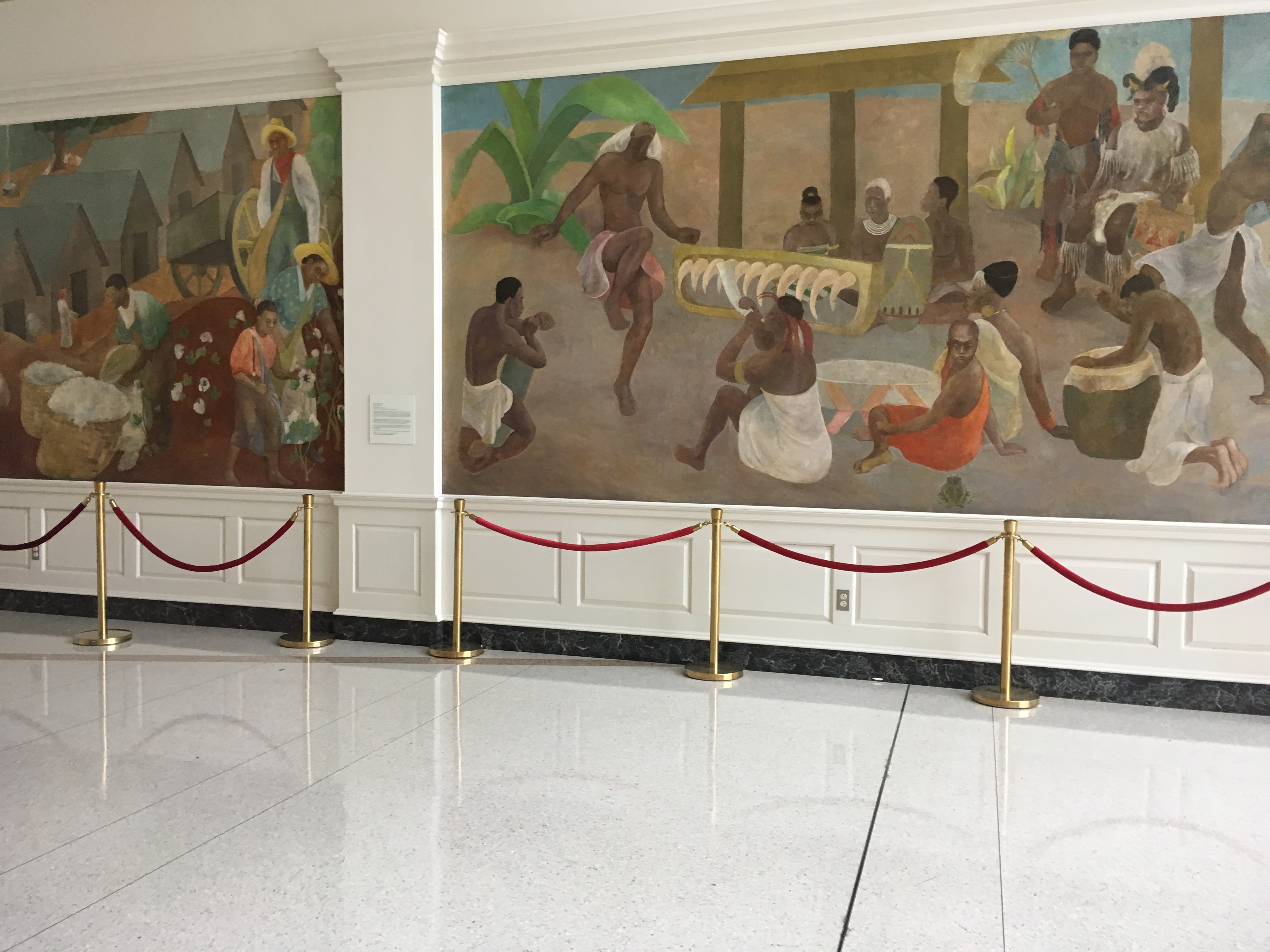 The artists — the last of whom, Georgette Seabrooke, died last year — were not well known and their murals portrayed ordinary people going about their daily lives. Vertis Hayes’s “Pursuit of Happiness” panel traces the African diaspora from 18th-century African village life to slavery in America to 20th-century freedom; from agrarian struggles in the South to professional success in the industrialized North.