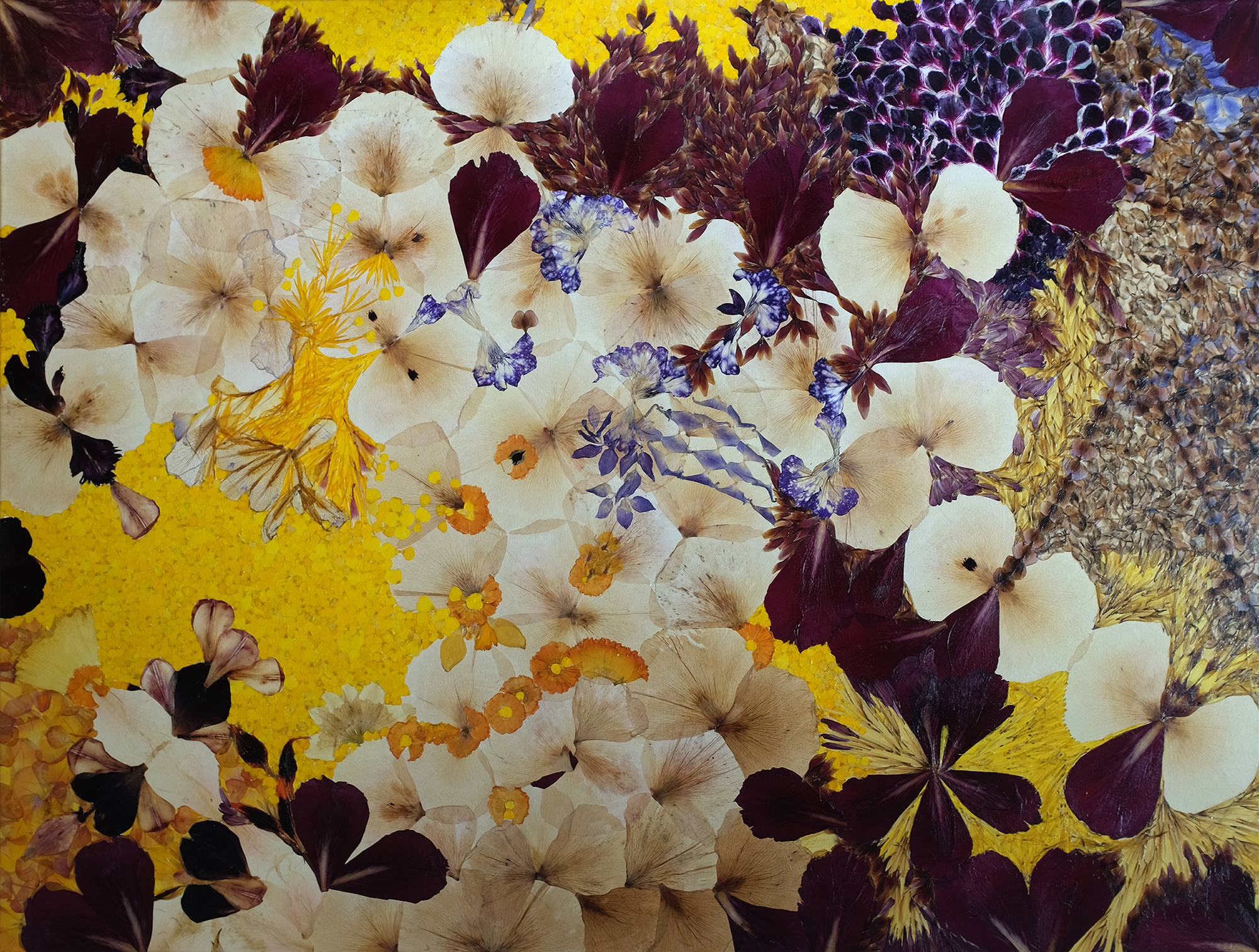 A collage of natural petals as they are.It is an attractive work that feels a sense of harmony in the wonder and beauty.Deflores by Valerie Hallier, picture taken by Valerie Hallier