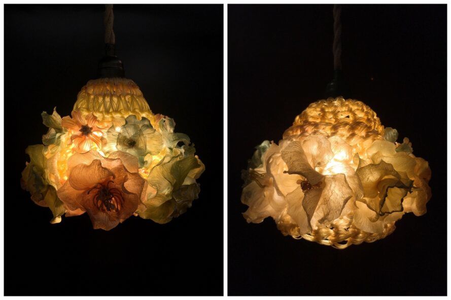 In the example of her floral pendant lamps made with agar, she makes the shade base by knitting agar yarn and decorating them with agar flowers cast from 3D-printed molds she designed. Her Agar Garden designs are an artistic endeavor into working with bio materials, while developing useful and pleasing interior design products. She’s also developed lamps and other products from silk and wool fabric samples, sequin scraps and lurex selvage yarns and mats made from a combination of agar, onion skins, spoiled milk and recycled saris.