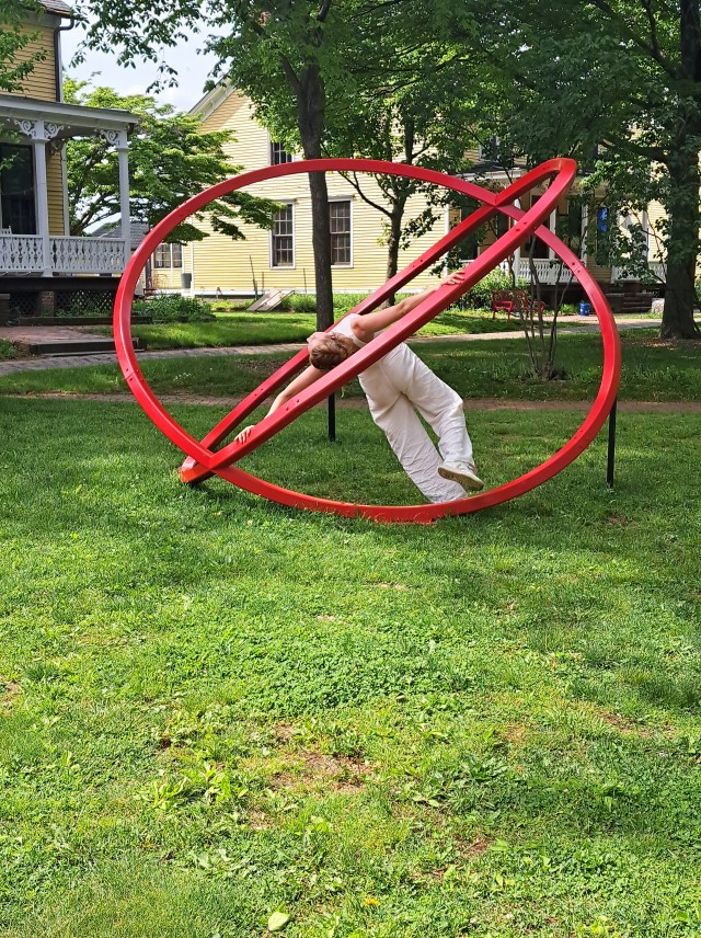 XOXO is an open heart made of two crossed circles. The sculpture balances at an angle and is made of hollow curved aluminum members with strategically located internal steel weights.