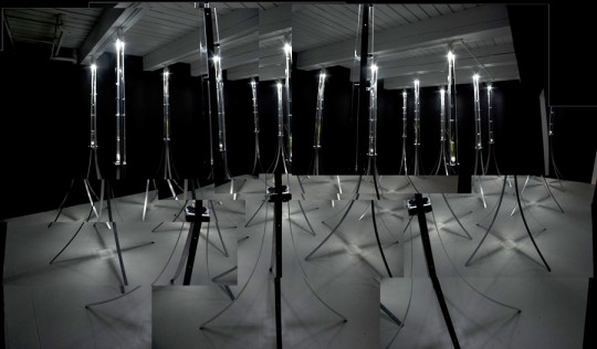 The installation is made up of 12 – 8’ tall by 48” diameter towers composed of aluminum carpet strips held together by various elements of re-purposed hardware. They will be securely installed with a central reinforced concrete base holding them down to the ground in a winding row with about 4 to 5 feet in between them for easy public access.Within each Garden Sentinel will be hanging an oversized plastic test tube filled with water within which will be planted an array of native plants throughout the season. At night the plants will be illuminated by an overhead solar powered light. The role of each Garden Sentinel is to stand guard over their charges, keeping the plants alive and vibrant for all to enjoy and learn more about the native gardens on Governors Island. Seen as a group their impact will either be that of a lab experiment coming to life, or a futuristic army of preservationists marching their way across the island guarding the future of the environment by focusing on the preciousness of the plants, while preserving and educating about them to viewers.